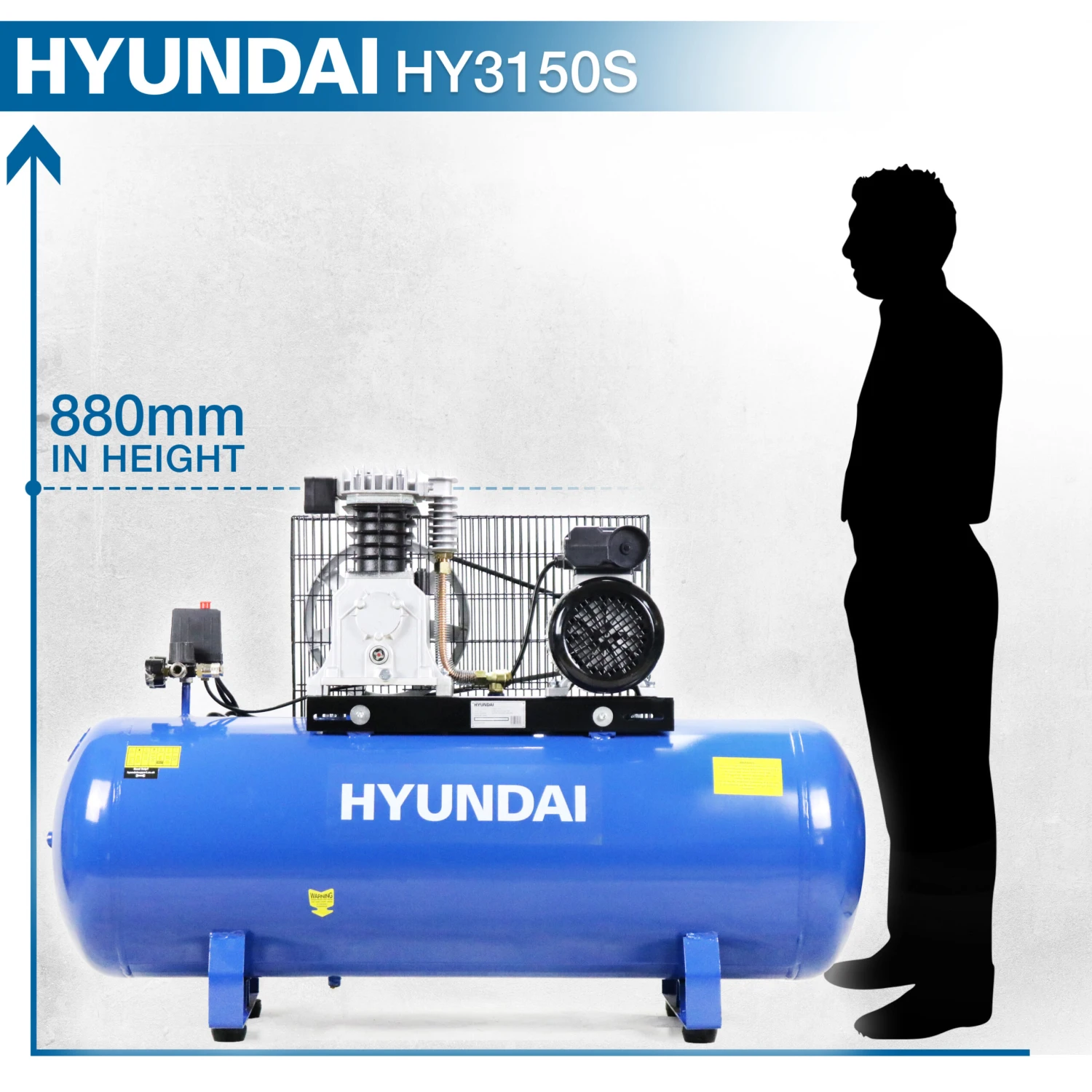 The HY3150S is a powerful 3hp twin cylinder cast iron belt drive air compressor from Hyundai. Designed for professional workshops and trade applications the HY3150S air compressor is ideal for spray-painting, air tools, inflating tyres and perfect for workshops and commercial garages.