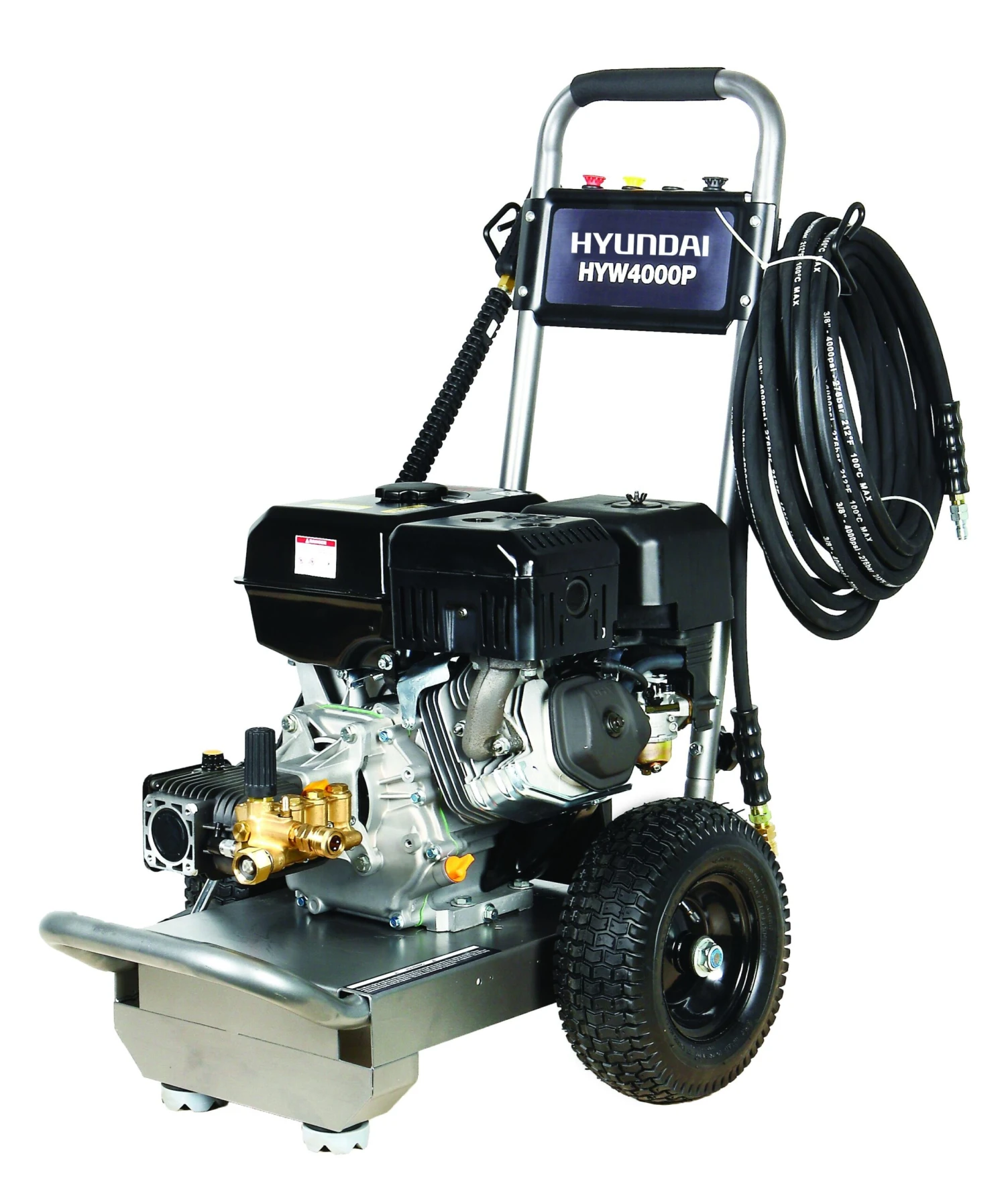 The HYW4000P is a new and extremely rugged petrol pressure washer, made by Hyundai. It has a powerful 14.0hp IC420 Hyundai engine, which helps to drive 15 litres of water per minute through the professionally classified Italian-made AR pump. Made by Annovi Reverberi, the pump has a powerful flow rate which helps to deliver a maximum output of nearly 4000psi, meaning that the washer has an extremely high quality clean and finish.