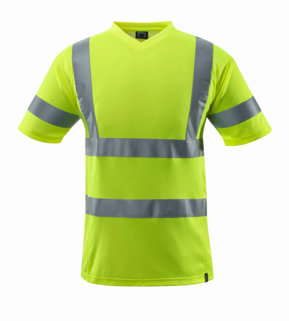 Premium. Fluorescent with vertical and horizontal reflective tapes. One-tone. Modern fit. Comfortable cotton inner and durable polyester outer. Elastic reflective strips. V-neck. Rib at neck. Neckband. Mesh with ventilation under sleeves.
