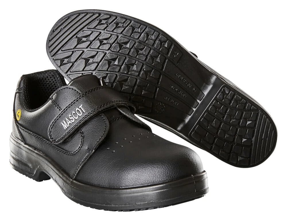 Prepared for HF chip. Lightweight. Washable. The front part of the shoe bends flexibly with the foot. Steel toe cap. Fastening with hook and loop band. Ventilated lining made from a micro-fibre material. Shock-absorbing. Ventilated insoles. Ladder grip. Water-repellent upper. Outer sole of PU/PU. Non-marking sole – no scuff marks. Ultra slip resistant sole. The sole is oil and water-repellent. ESD Approved to EN 61340-4-3: 2002.