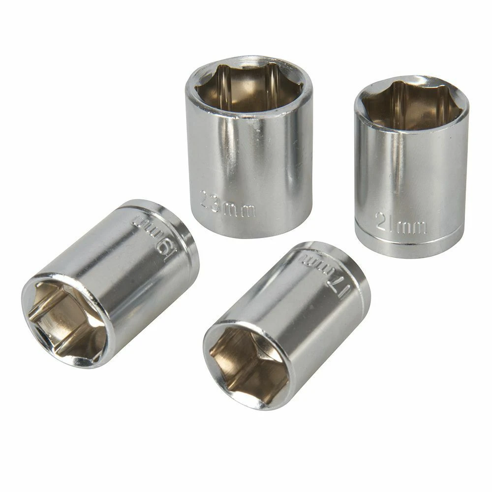 – Includes 17,19, 21 and 23mm hardened steel sockets.