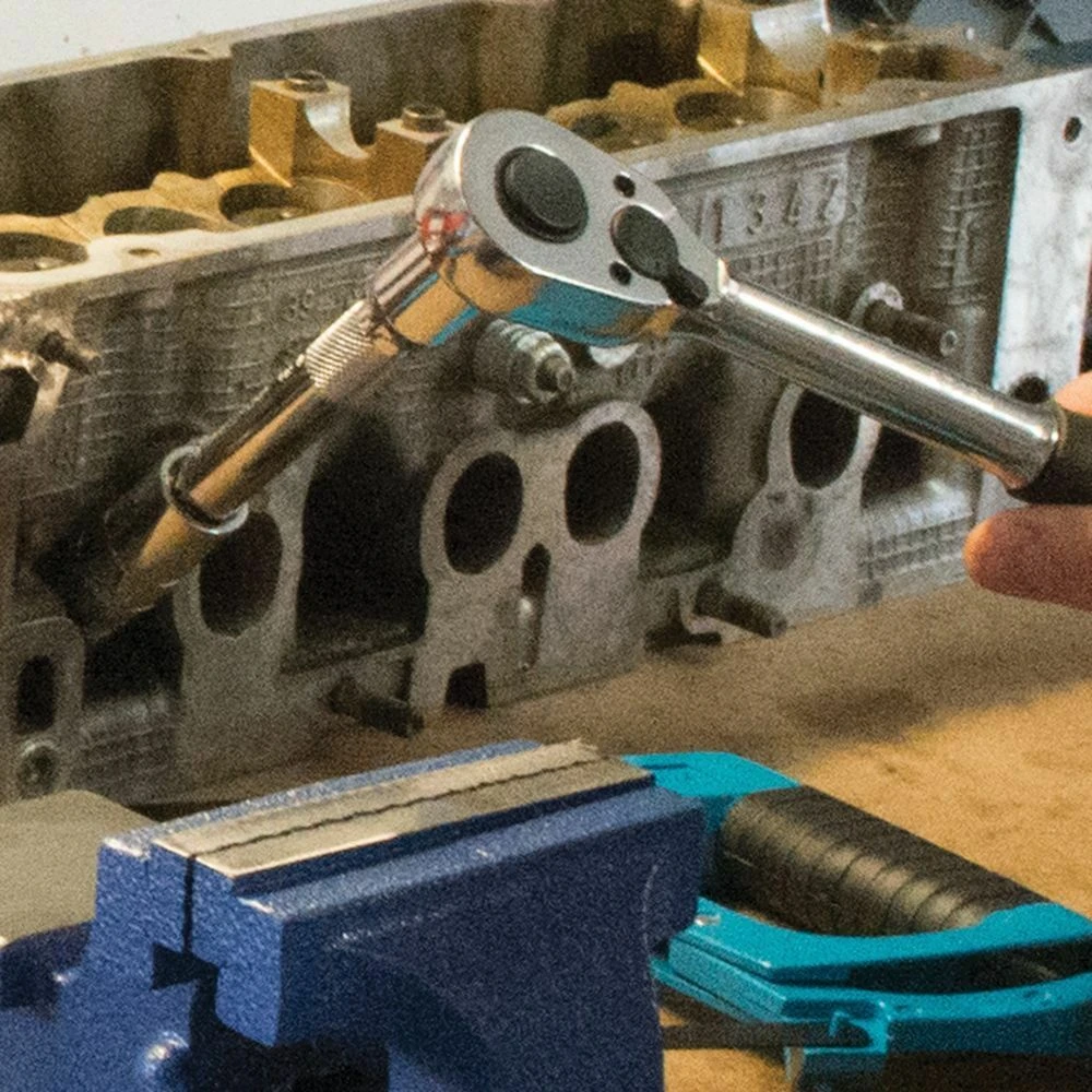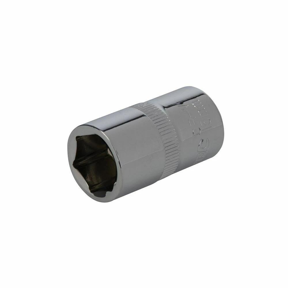 – Chrome vanadium sliding T-bar, 1 x universal joint, 14 x sockets: 10, 11, 12, 13, 14, 15, 16, 17, 19, 22, 24, 27, 30 and 32mm; quick release, polished ratchet handle with rubber grip, 2 x extension bars 125 and 250mm; 2 x spark plug sockets 13/16in and 5/8in.