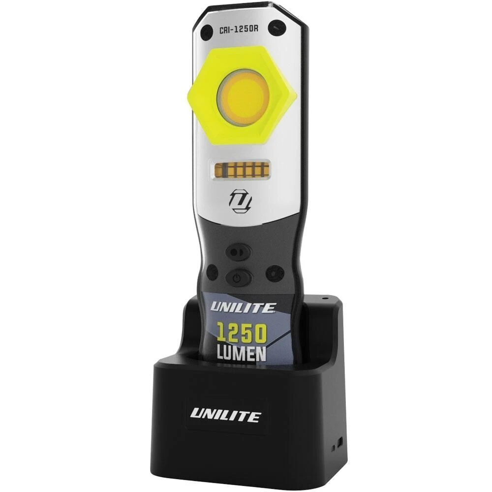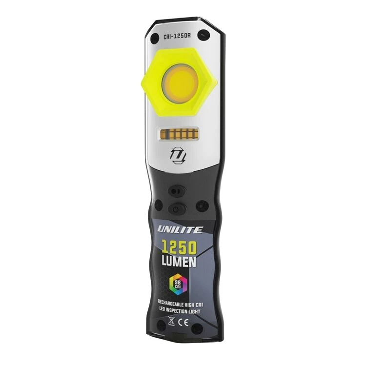 The CRI-1250R is a rechargeable powerful high CRI 96+ 1250 lumen Compact Detailing Light. 3 colour temperatures of 2700K / 4500K /6500K and additional 5W 385nm UV LED makes it perfect for automotive, detailing, painting or plastering work. Waterproof and shockproof with ratings of IP65 and IK07, ensuring both durability and robustness. Strong integral magnets on back and base, as well as 360deg rotating retractable hanging hook ensure handsfree deployment in a variety of situations. It has useful battery level and charging indicator LEDs and charging options include charge USB Type-C and magnetic charging base.
