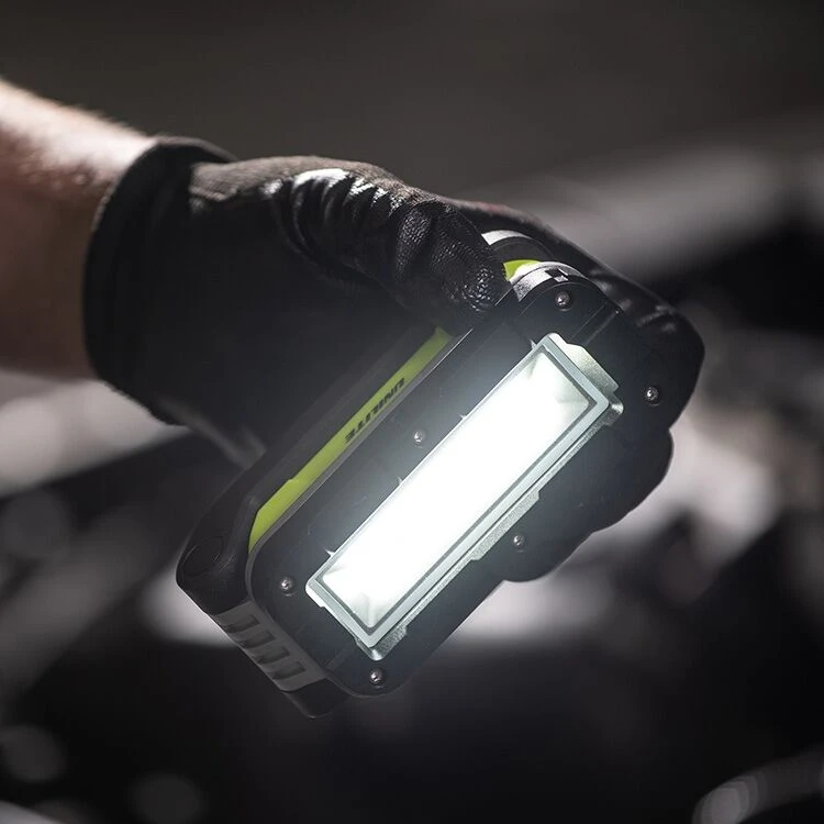 The SLR-1000 is a folding portable worklight that has a 1000 Lumen output via COB LED. In addition it has a 300 Lumen LED flashlight in its head for spot work. Powering it is a 5200mAh Li-ion battery which can be charged via micro-USB when required. For placement it has a 180deg adjustable magnetic stand which features an additional hook. Surrounding the light is a glow in the dark strip, helping it to be seen and enabling it to be used as emergency lighting. An IPX5 water resistance keep it safe from light rain.